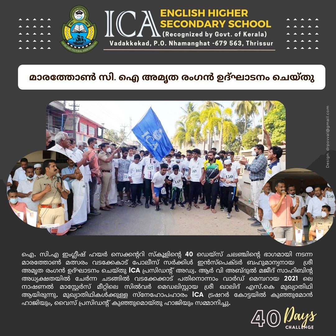 ഐ. സി.എ ഇംഗ്ലീഷ് ഹയർ സെക്കന്ററി സ്കൂളിന്റെ 40 ഡെയ്സ് ചലഞ്ചിന്റെ ഭാഗമായി നടന്ന മാരത്തോൺ മത്സരം വടക്കേകാട് പോലീസ് സർക്കിൾ ഇൻസ്പെക്ടർ ബഹുമാന്യനായ ശ്രീ അമൃത രംഗൻ ഉദ്ഘാടനം ചെയ്തു lCA പ്രസിഡന്റ് അഡ്വ. ആർ വി അബ്ദുൽ മജീദ് സാഹിബിന്റ അധ്യക്ഷതയിൽ ചേർന്ന ചടങ്ങിൽ വടക്കേക്കാട് പതിനൊന്നാം വാർഡ് മെമ്പറായ 2021 ലെ നാഷണൽ മാസ്റ്റേർസ് മീറ്റിലെ സിൽവർ മെഡലിസ്റ്റായ ശ്രീ ഖാലിദ് എസ്.കെ മുഖ്യാതിഥി ആയിരുന്നു. മുഖ്യാതിഥികൾക്കുള്ള സ്നേഹോപഹാരം lCA ട്രഷറർ കോട്ടയിൽ കുഞ്ഞുമോൻ ഹാജിയും, വൈസ് പ്രസിഡന്റ് കുഞ്ഞുമൊയ്തു ഹാജിയും സമ്മാനിച്ചു.